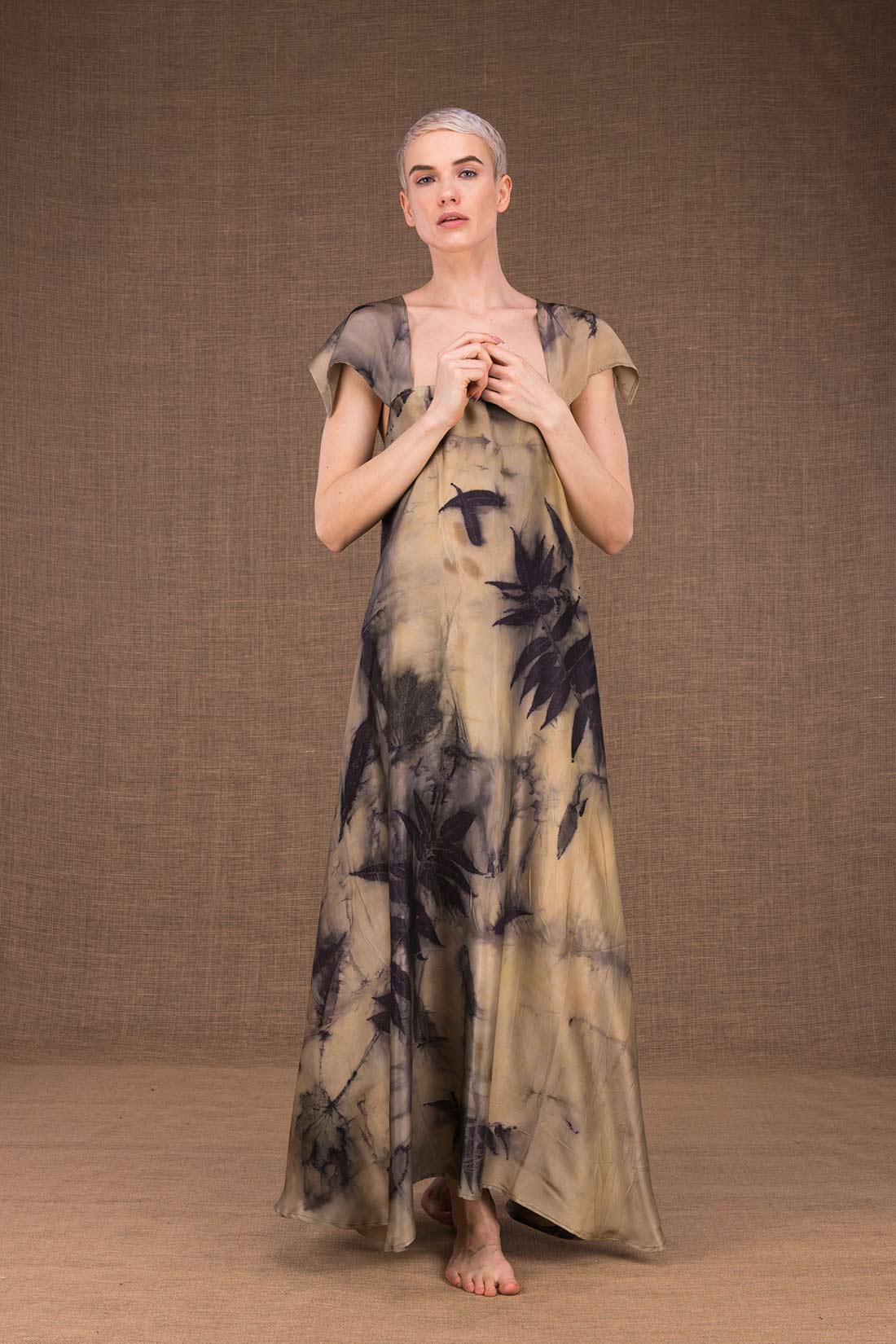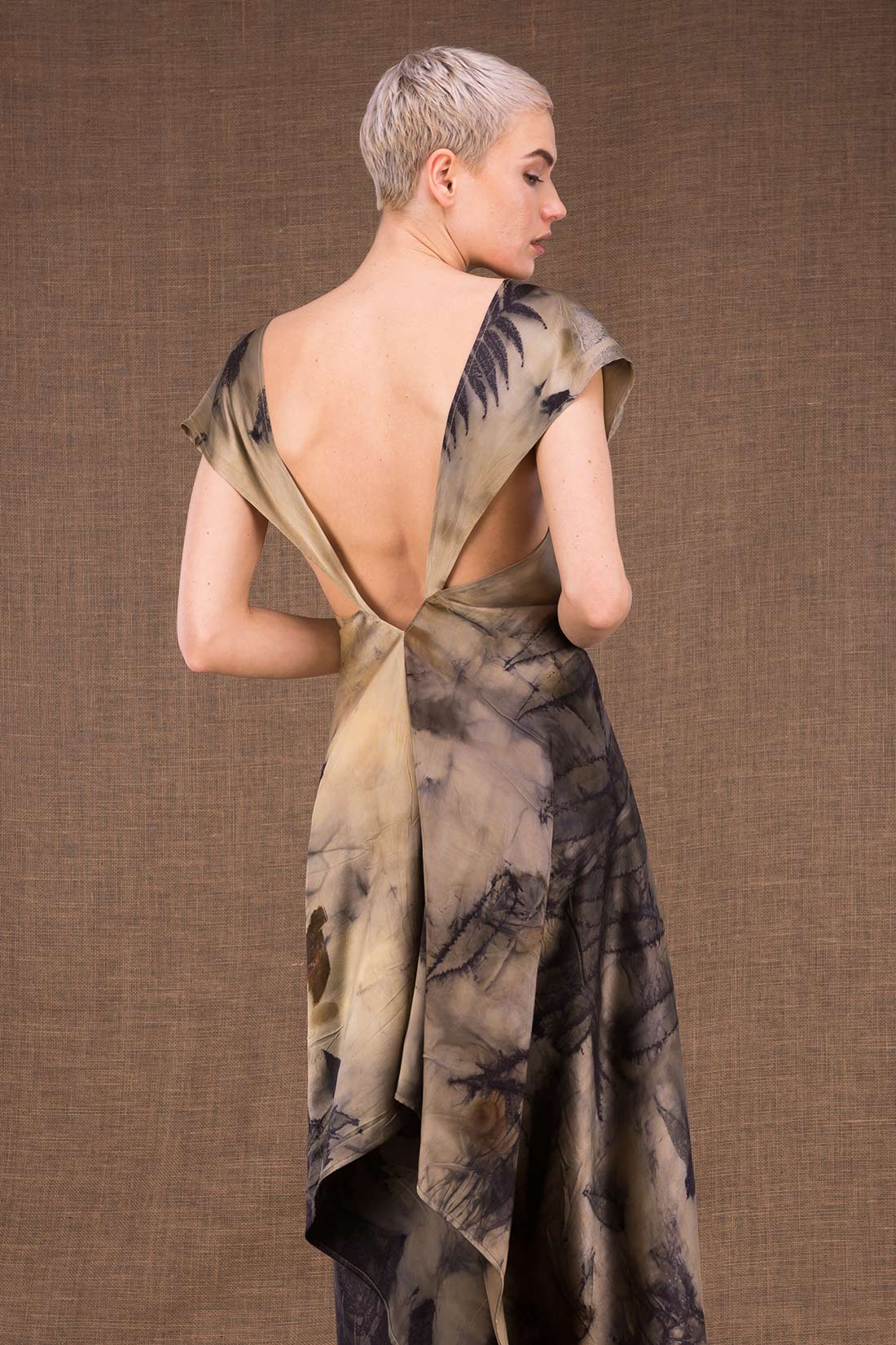 Beige blue long naked back printed silk satin dress GAIA. The thousand and one nights long eco-print dress.