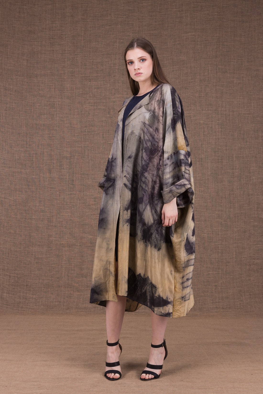 Beige blue printed silk kimono dress SUMAK. Elegance and refinement with eco-print!