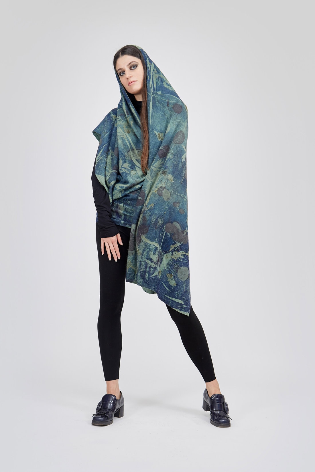 Blue large printed wool shawl SOURCE. Wrap yourself in nature with Eco-Print!