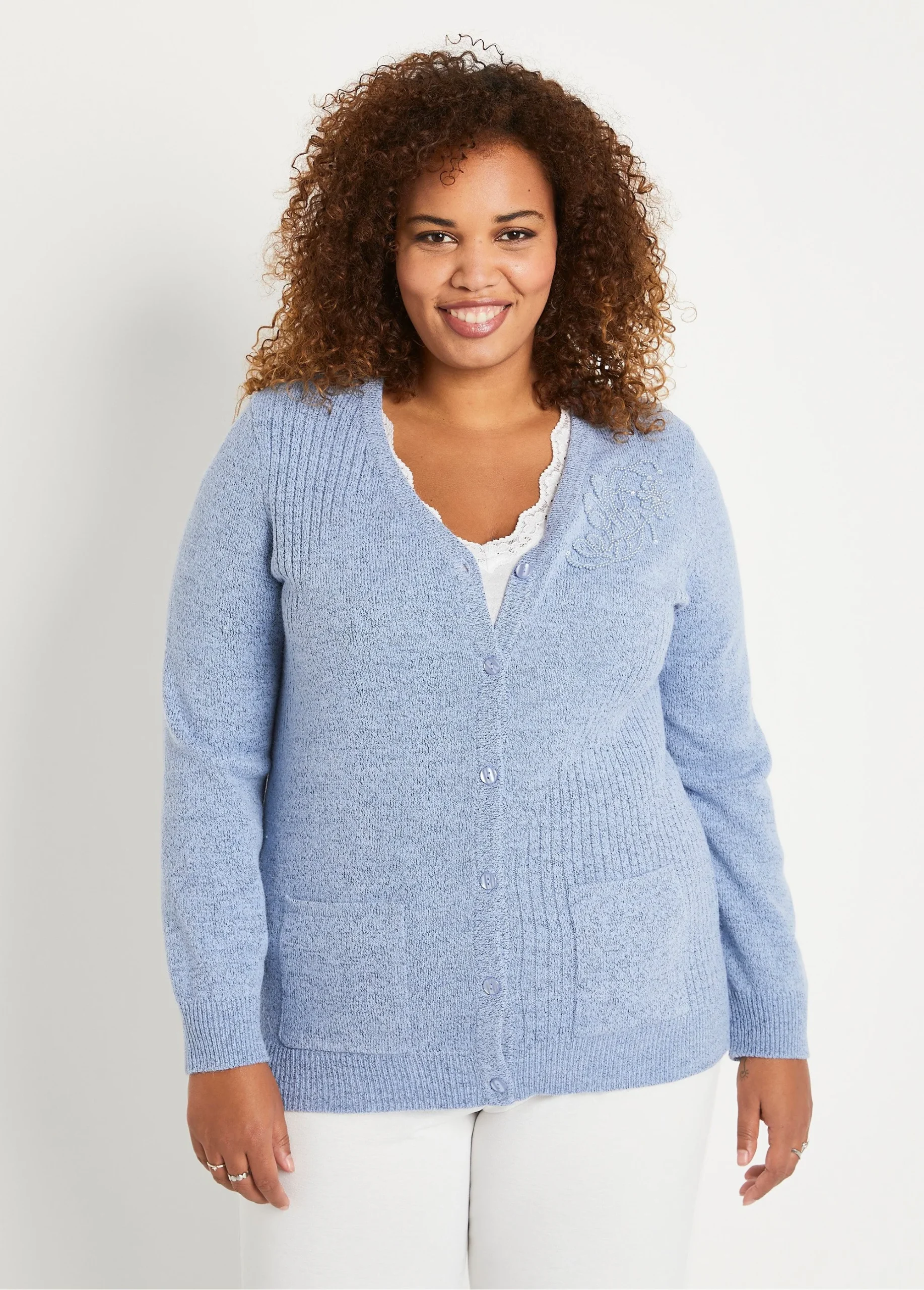 Le gilet réchauffe la silhouette en beauté. Devant : jeux de côtes, 2 poches plaquées et fantaisie brodée, perlée et strassée. Bord-côtes rapporté à l’encolure V et le long de la patte de boutonnage. Bord-côtes tenant à la base et au bas des manches longues.