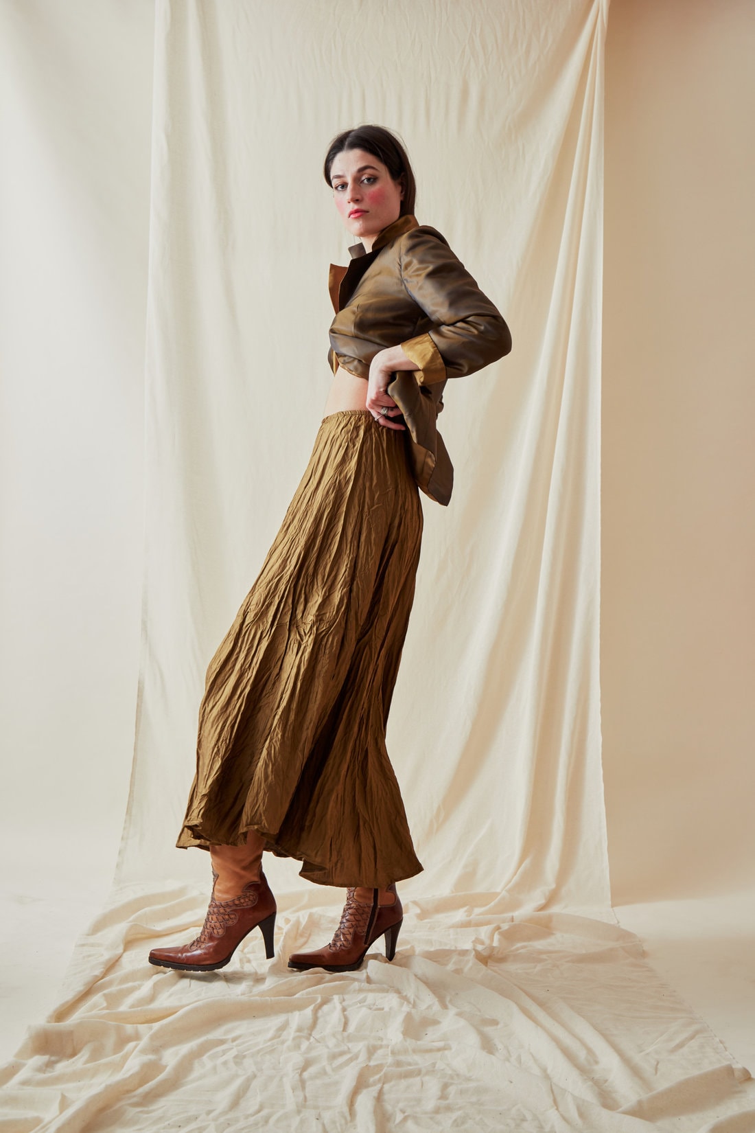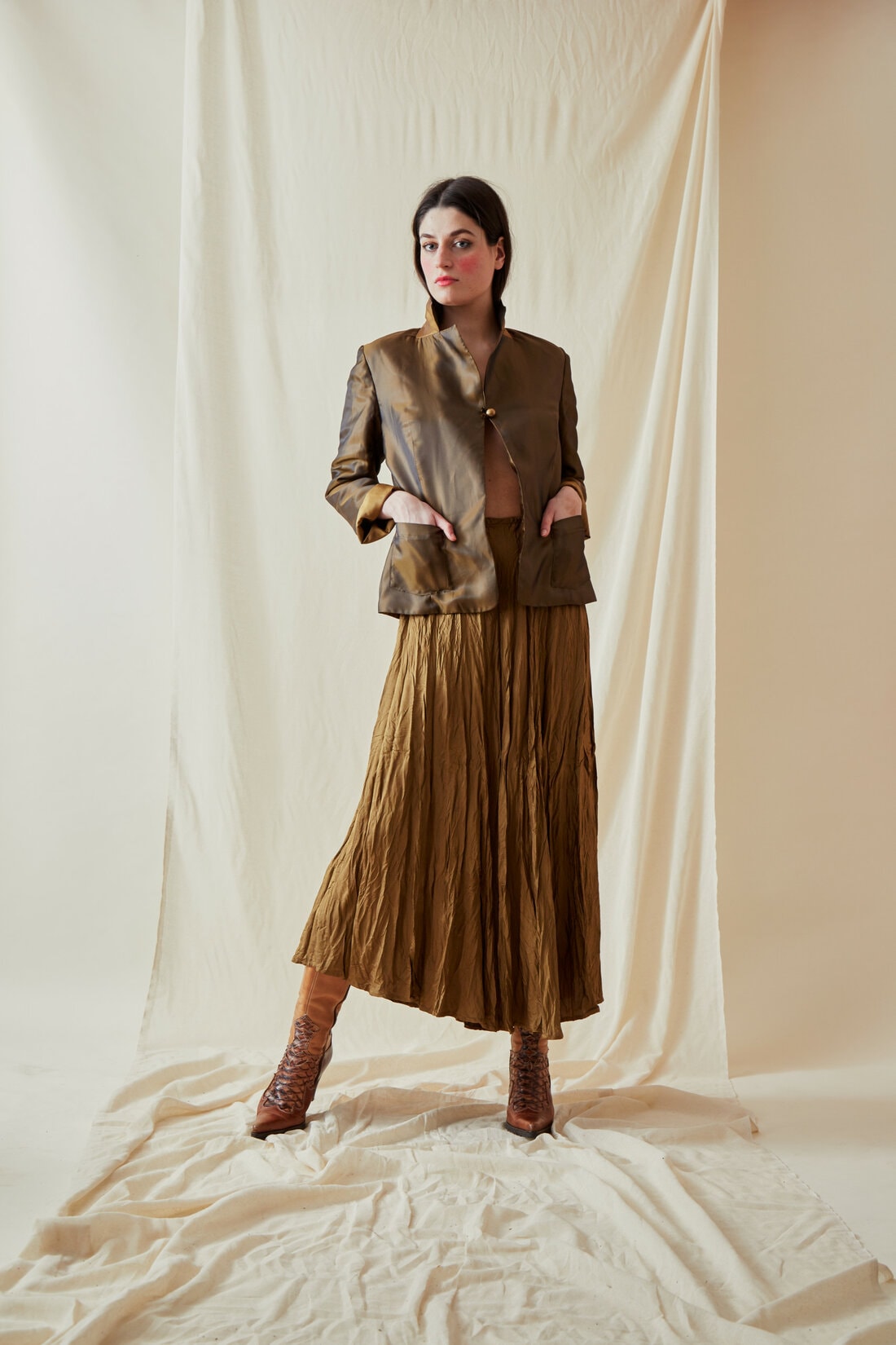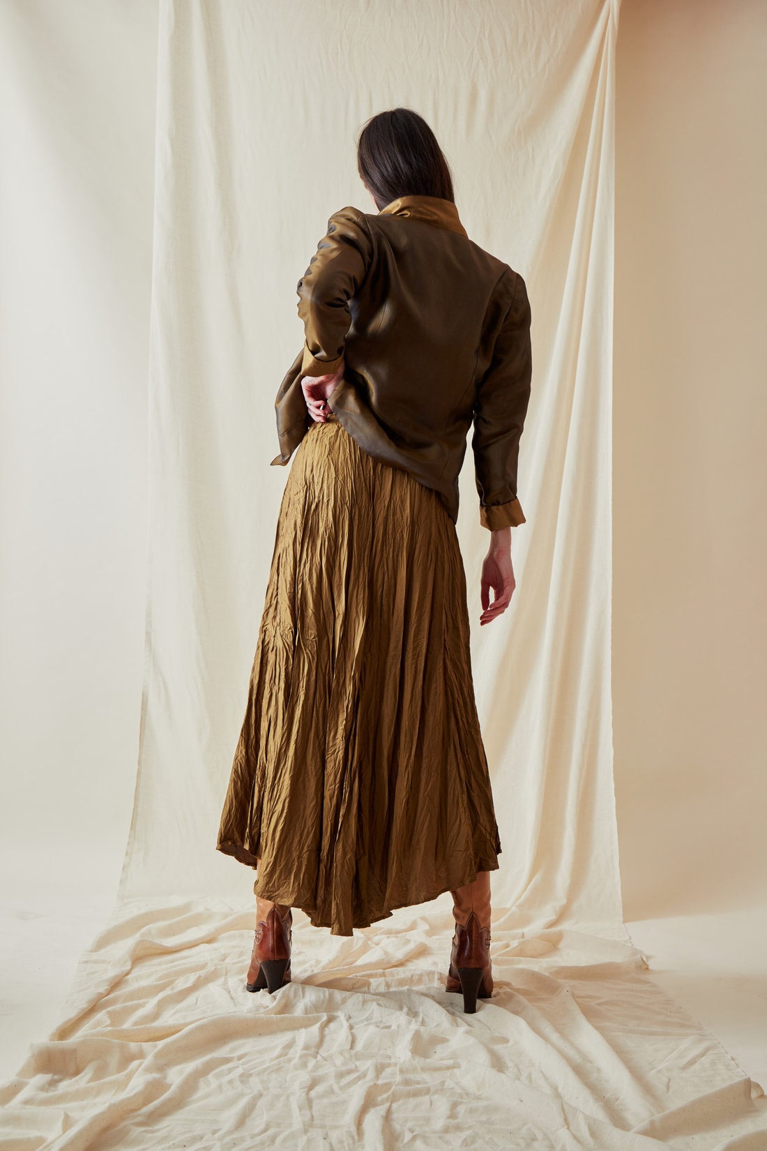 Jupe jaune marron mi-longue évasée en viscose LIPSI. Elle est réversible et dansante, avec son éclat bronze et or.