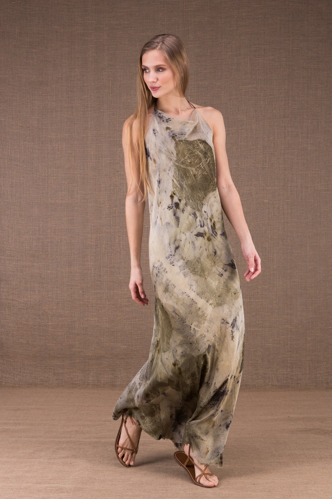 Khaki long backless halter printed silk dress SARA. Naked back loose dress with handmade eco-print.