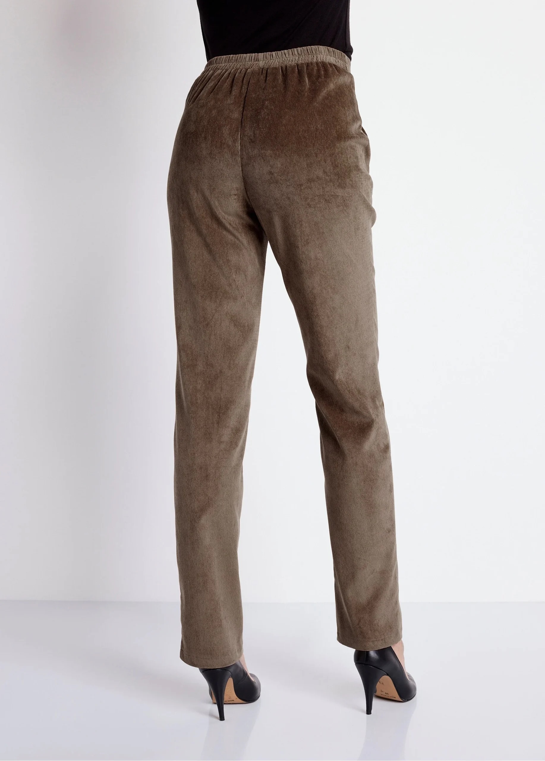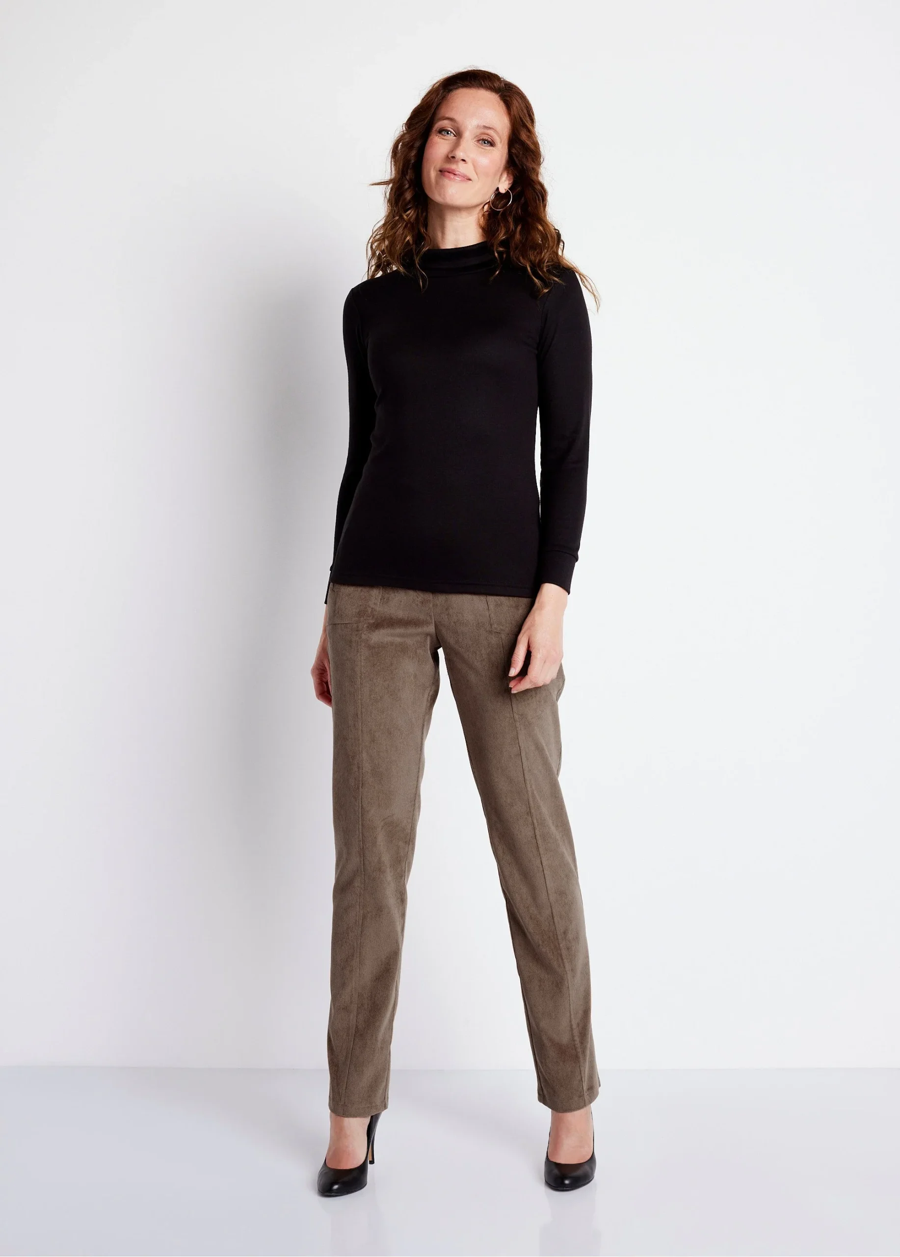 Coupe droite impeccable et allure irréprochable pour le pantalon femme. Le secret de son confort ? Un velours extensible indéformable très agréable à porter et une coupe ventre plat avec ceinture plate élastiquée dos qui ne comprime pas la taille. Devant : fausse braguette, piqûre allongeante le long des jambes et 2 poches fantaisie plaquées avec entrée latérale passepoilée. Fabrication française.