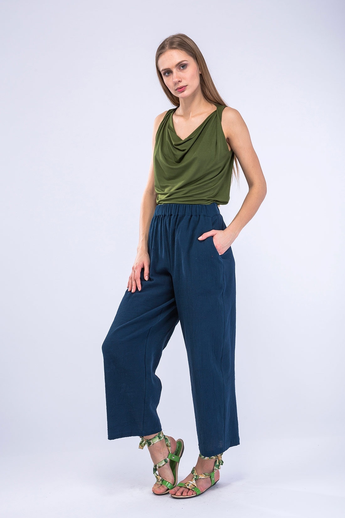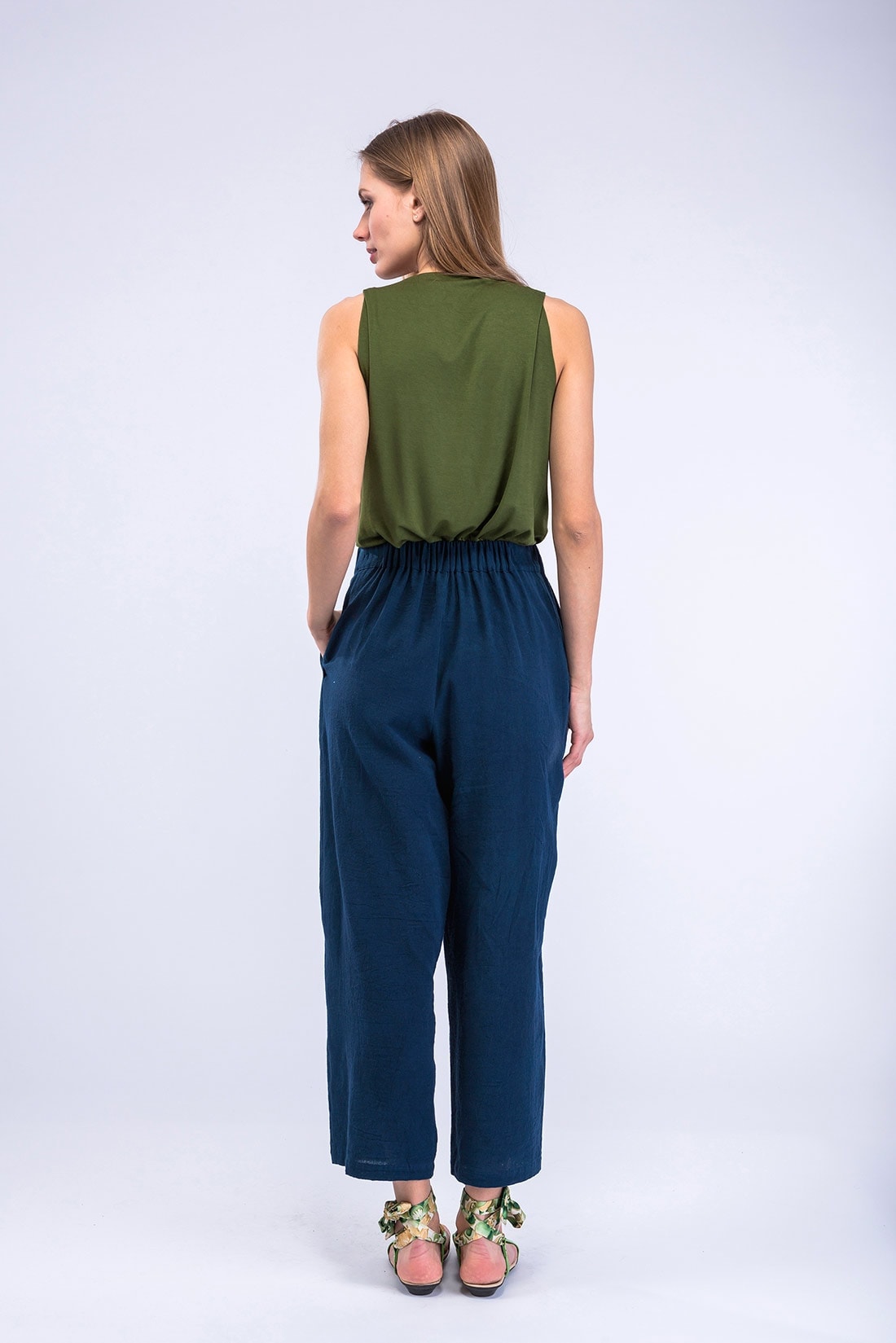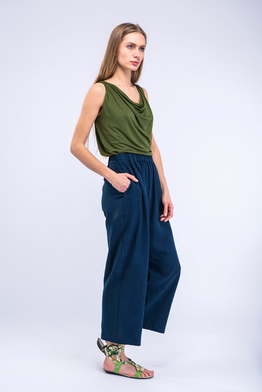 Peacock blue large organic cotton trousers for women HALNY. Comfort first.
