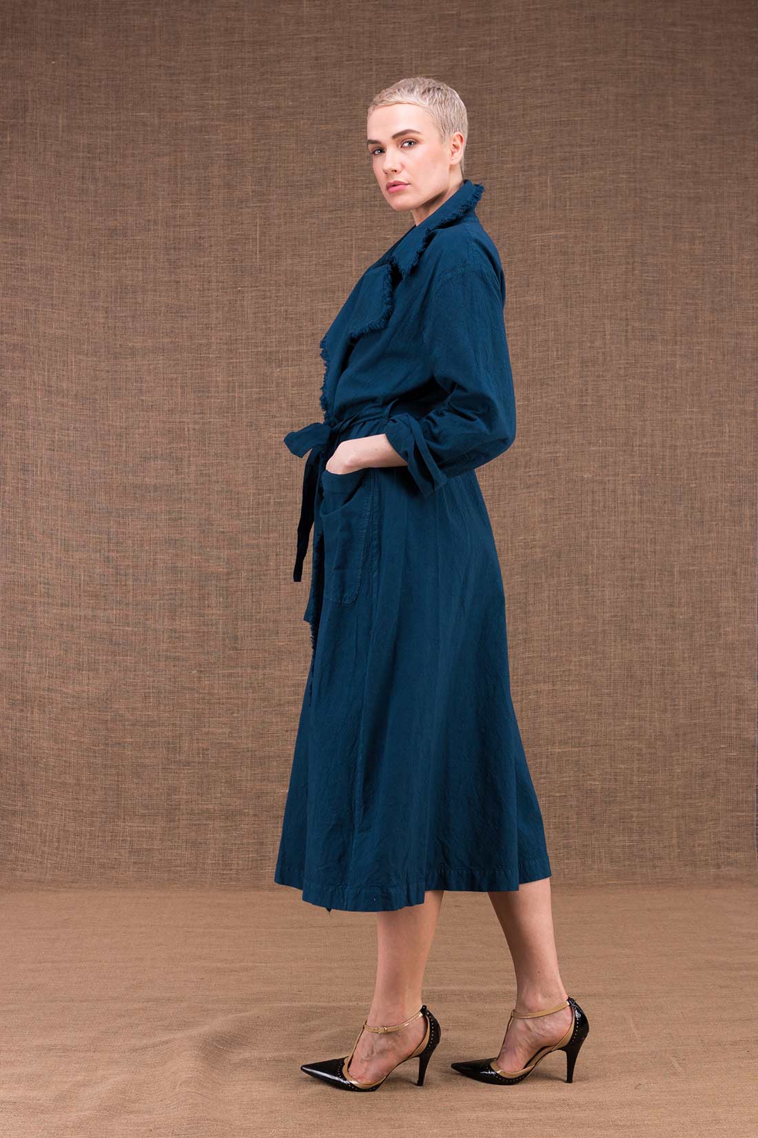 Peacock blue organic cotton trench coat for women BOGART. A long coat to absolutely have at home!
