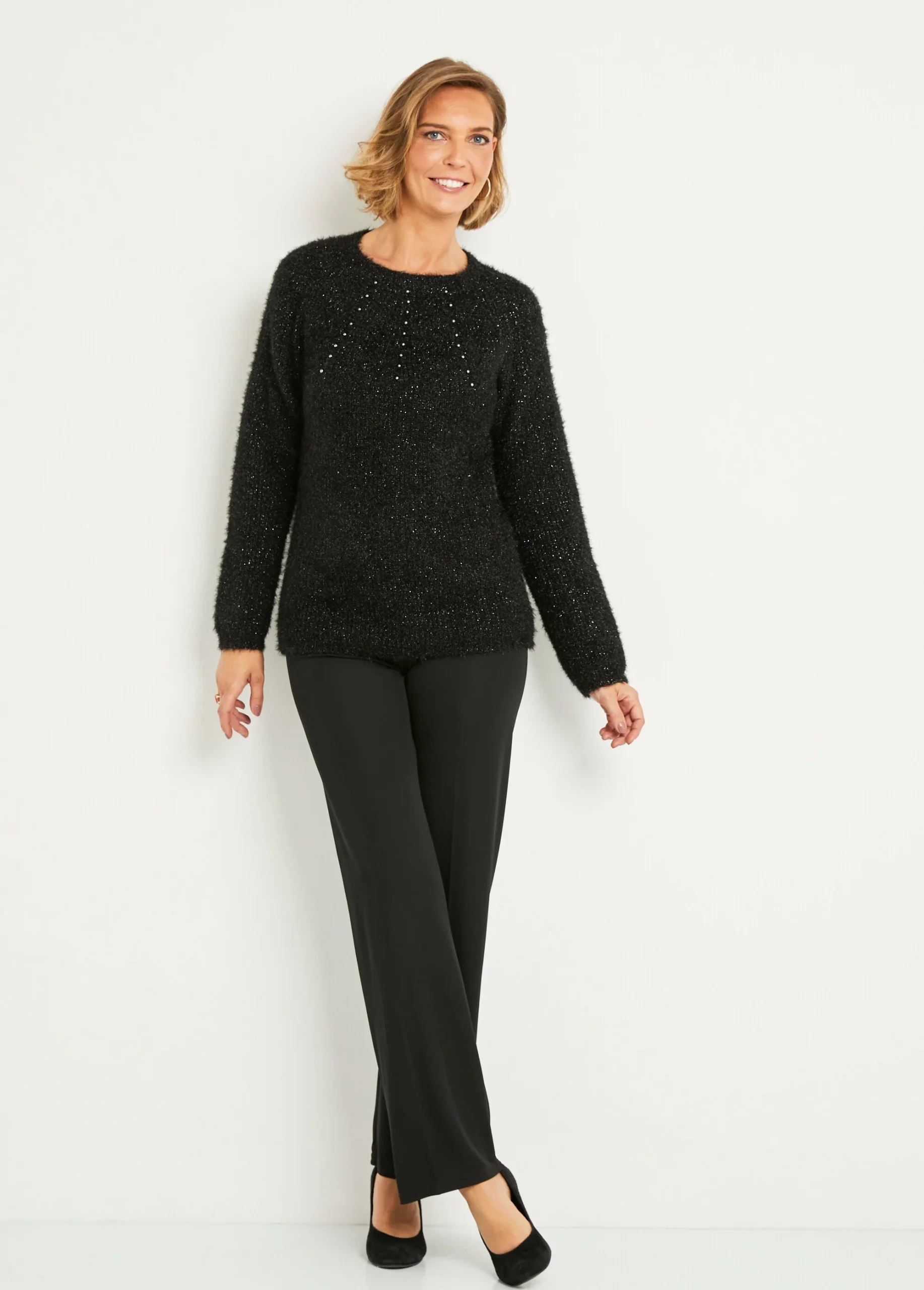 Pour un hiver tout en douceur, le pull se fait chic en misant sur une maille poilue au bel effet irisé, avec une fantaisie perlée et ajourée délicatement placée devant. Les emmanchures raglan accentuent son style féminin et des finitions bord-côtes soulignent le col rond, le bas des manches longues et la base.