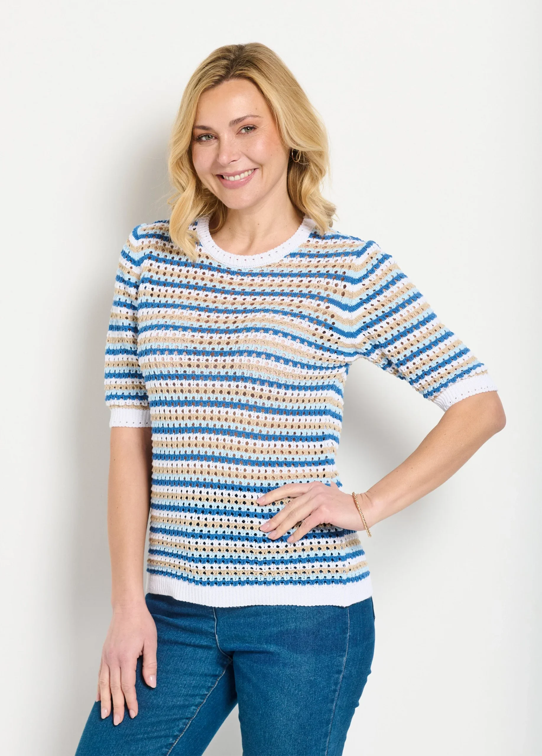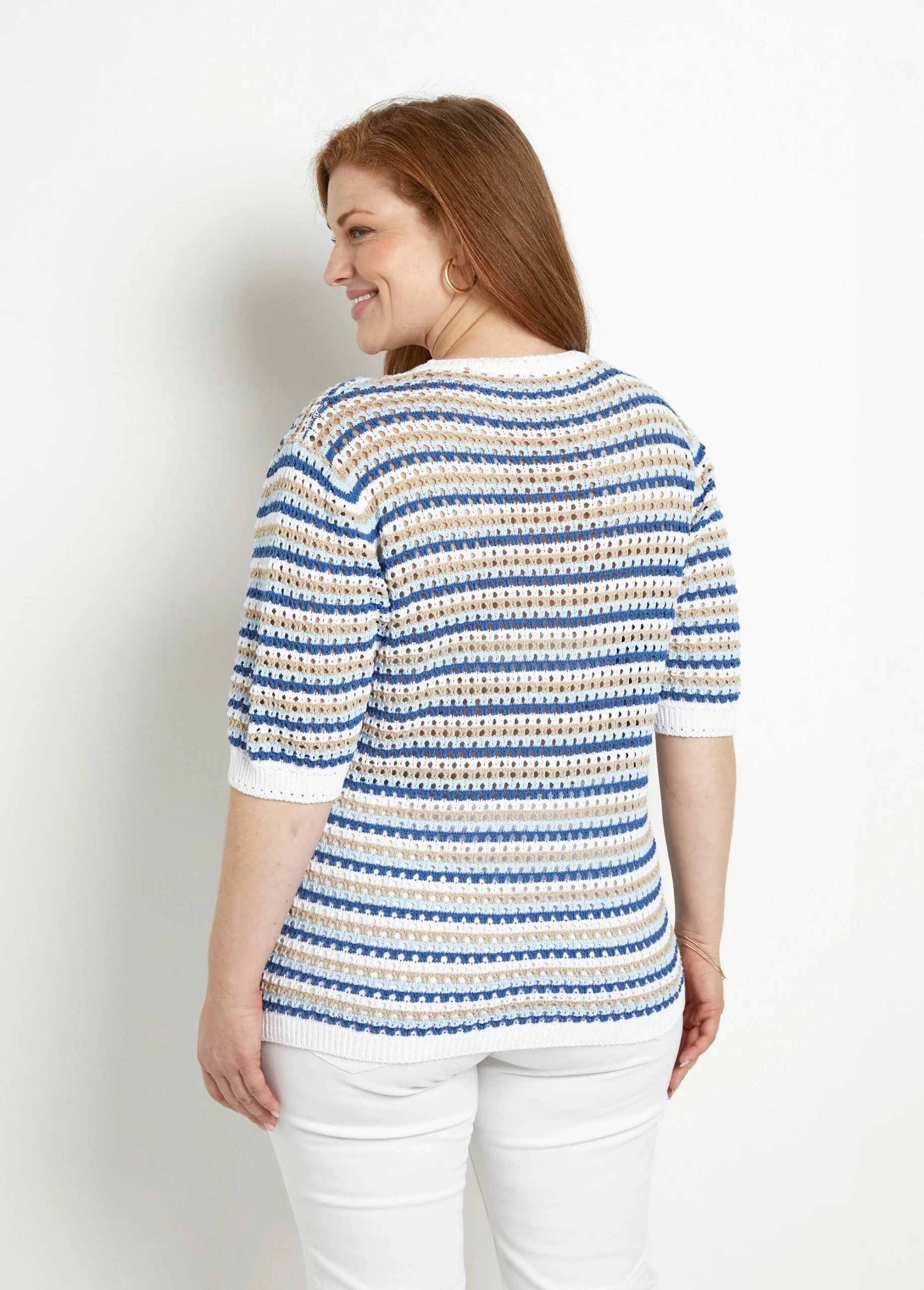Tendance ajourée et total look rayé… Le pull manches courtes hausse le ton et donne du style à la saison. Les rayures sont particulièrement mises en valeur par le bord-côtes uni au col rond, au bas des manches et à la base.