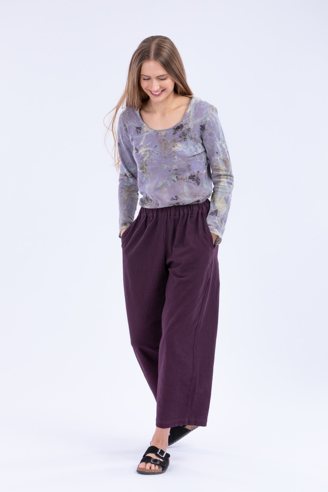 Purple large organic cotton trousers for women HALNY. Comfort first.