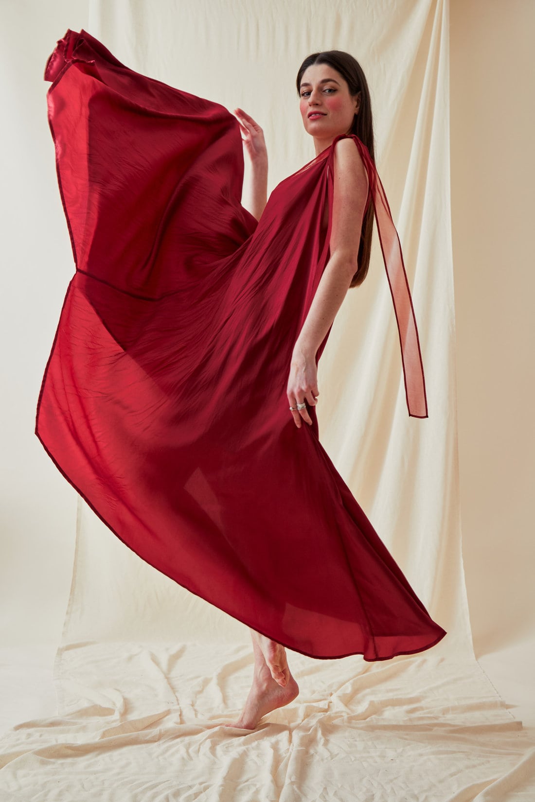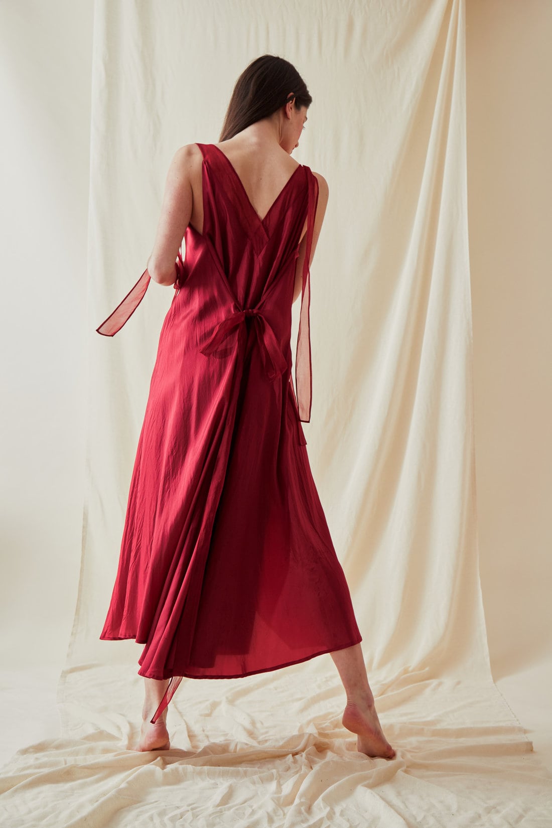 You’ll love the sophisticated cut and plunging silk organza neckline of this gorgeous viscose dress. It can be worn every day or for a special occasion, like a wedding. The ample bias cut can be adapted with a silken tie, to highlight the waist.