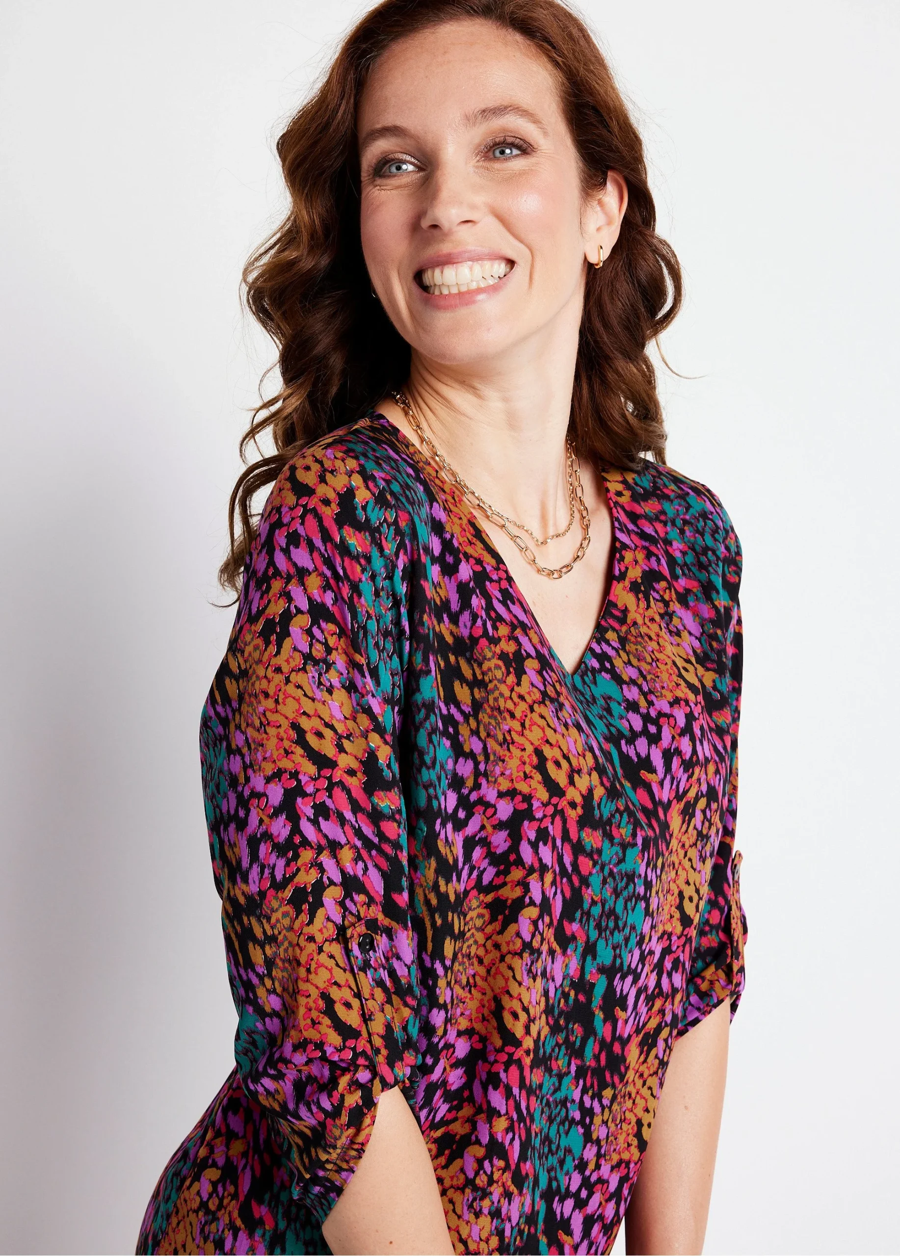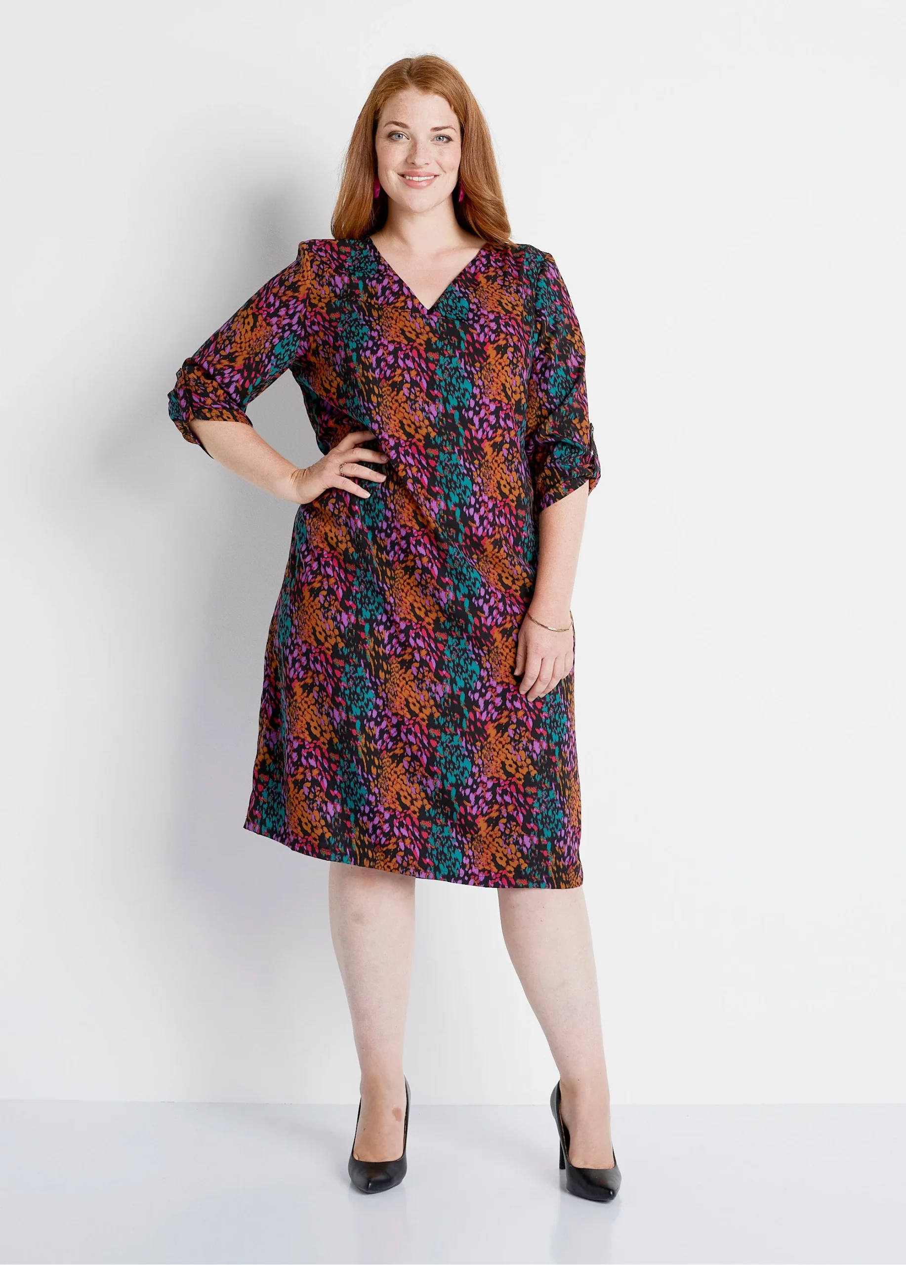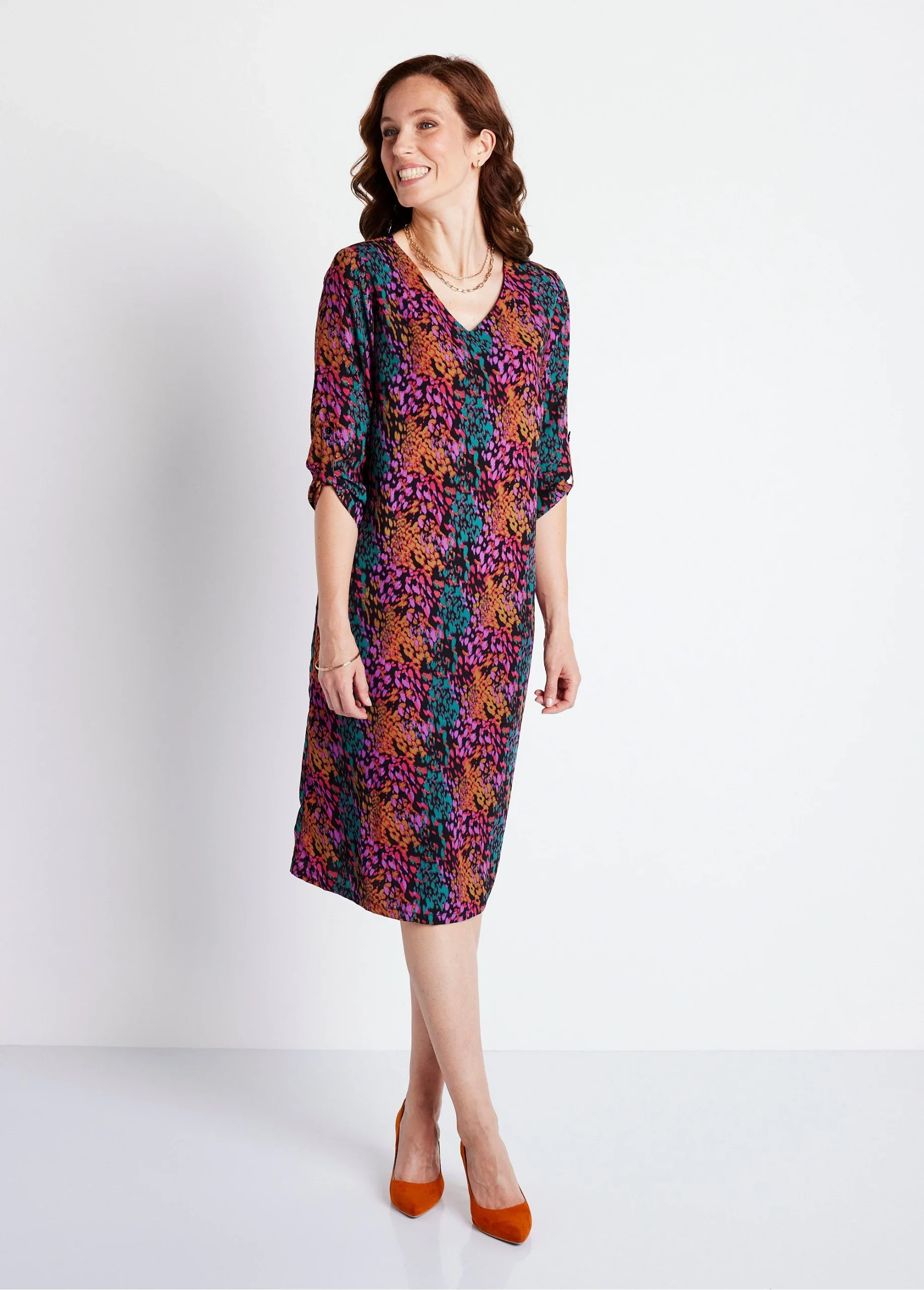 Imprimé tachiste pour la robe-housse droite, facile à porter au quotidien. Col V devant, collerette intérieure. Biais rapporté à l’encolure dos. Manches 3/4 retroussables par patte boutonnée. Fabrication française.