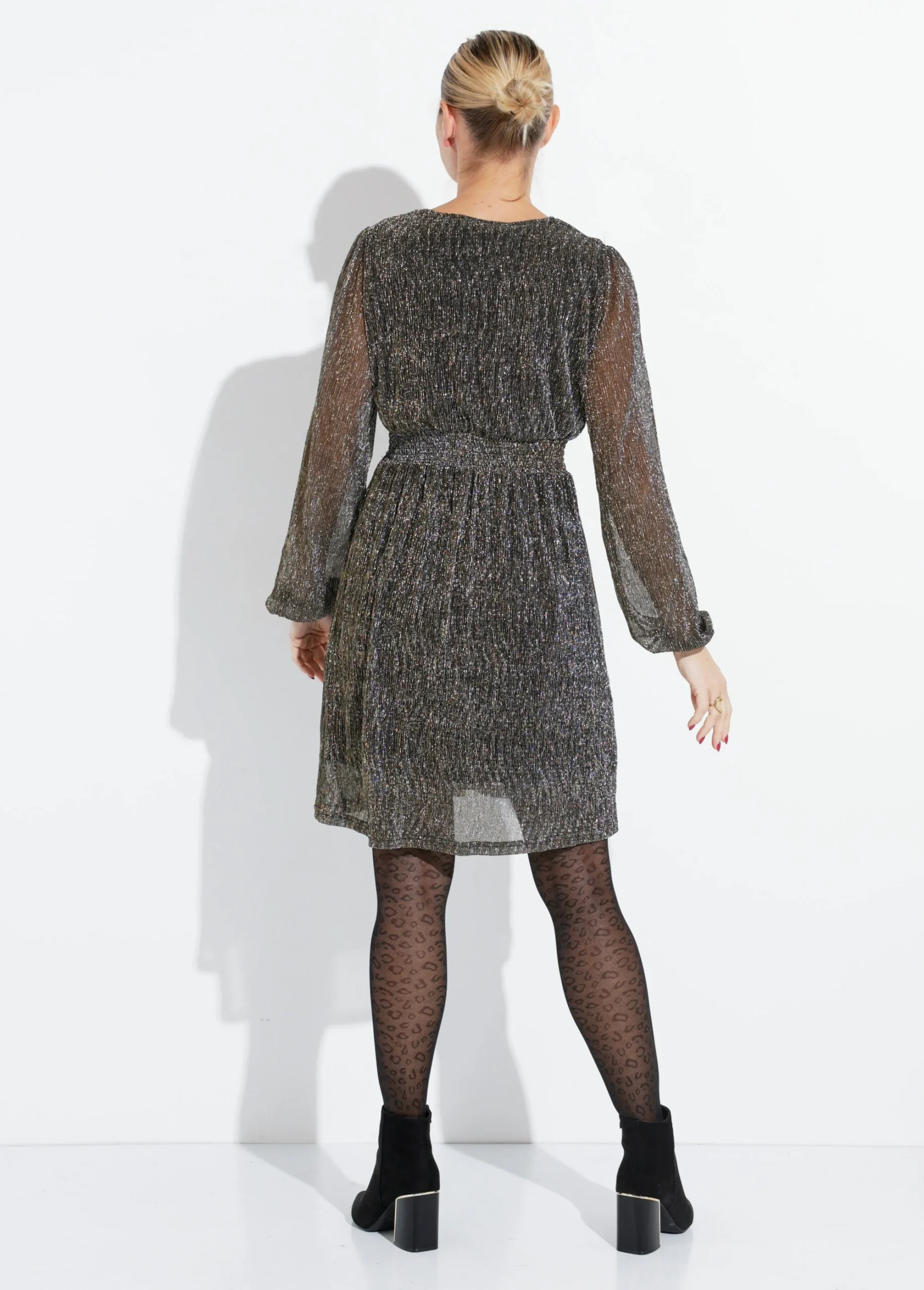 Cette robe courte pailletée à taille haute est le choix parfait pour briller lors de vos soirées festives. Son voile délicatement pailleté capte la lumière avec élégance, ajoutant une touche de glamour à votre look. Les poignets resserrés par élastique apportent une silhouette raffinée tout en offrant un confort optimal. Pour un style encore plus chic, associez-la à des escarpins scintillants et des accessoires minimalistes. N’oubliez pas d’ajouter une pochette assortie pour parfaire votre tenue et faire sensation à chaque événement.