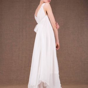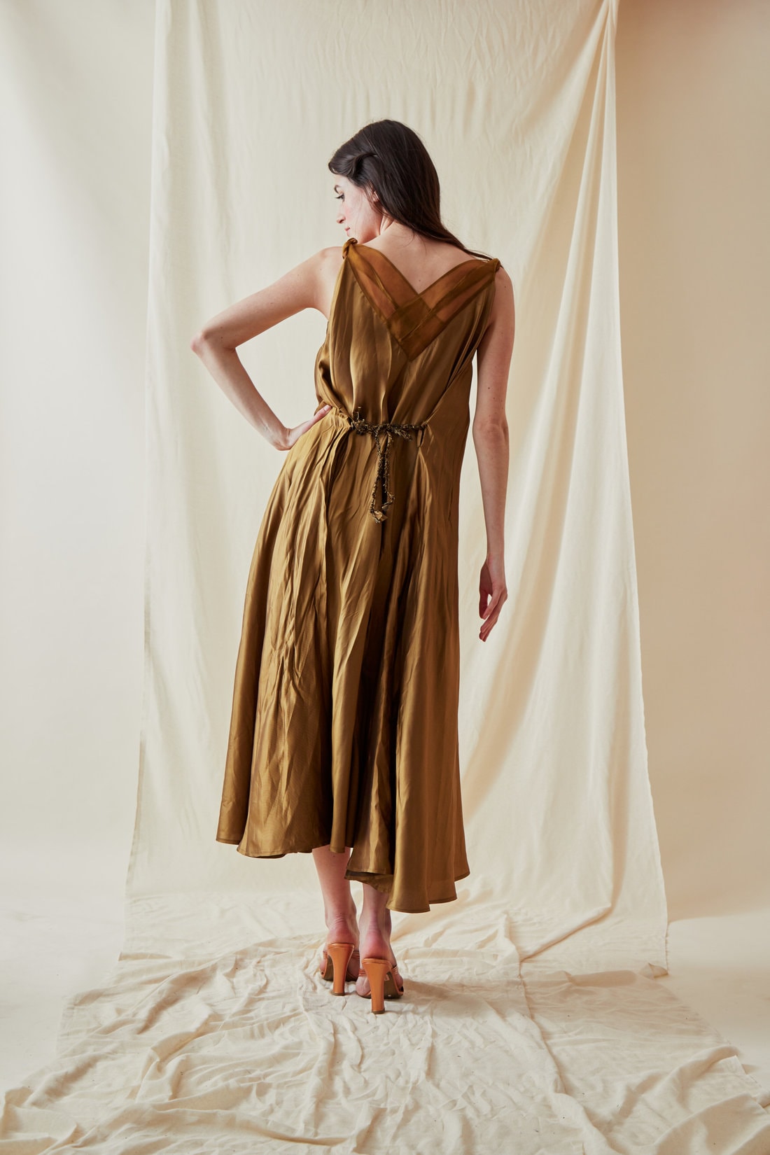 Avec sa coupe raffinée, sa couleur or, et son décolleté en V tressé en organza de soie, cette robe sublime ne vous laissera pas indifférente. Elle peut se porter tous les jours comme dans les grandes occasions, tels les mariages. Sa forme ample, coupée en biais, peut aussi être modifiée grâce à un lien qui souligne la taille.