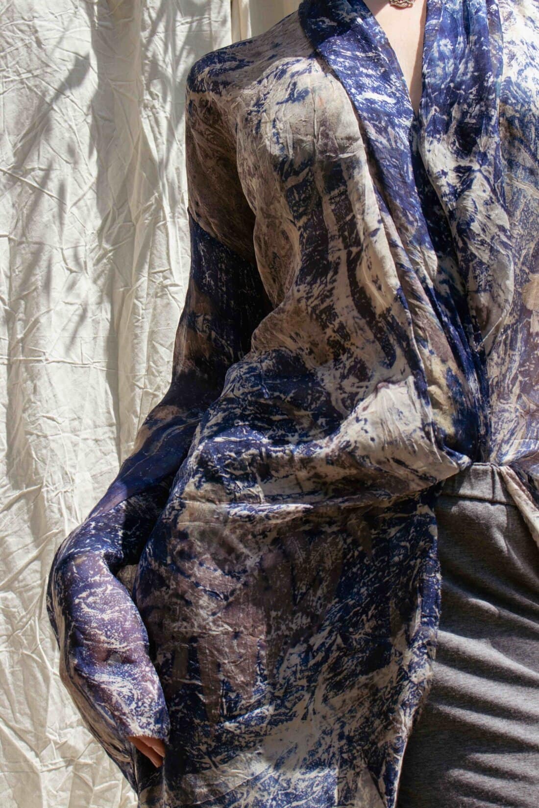 Enhance your wardrobe with this favorite piece. Silk chiffon kimono with an eco-print handmade by ASKA. It can be worn in the city or at the beach, and can be draped as you wish, loose or cinched at the waist with our tie belts.