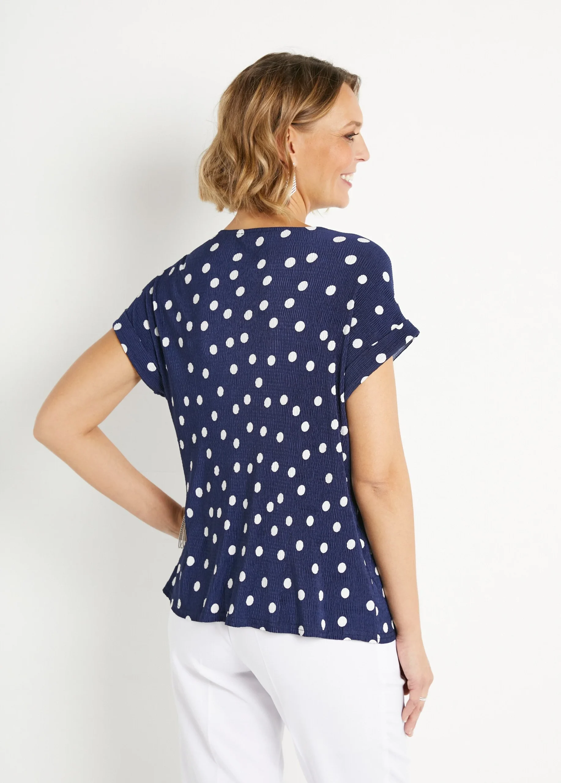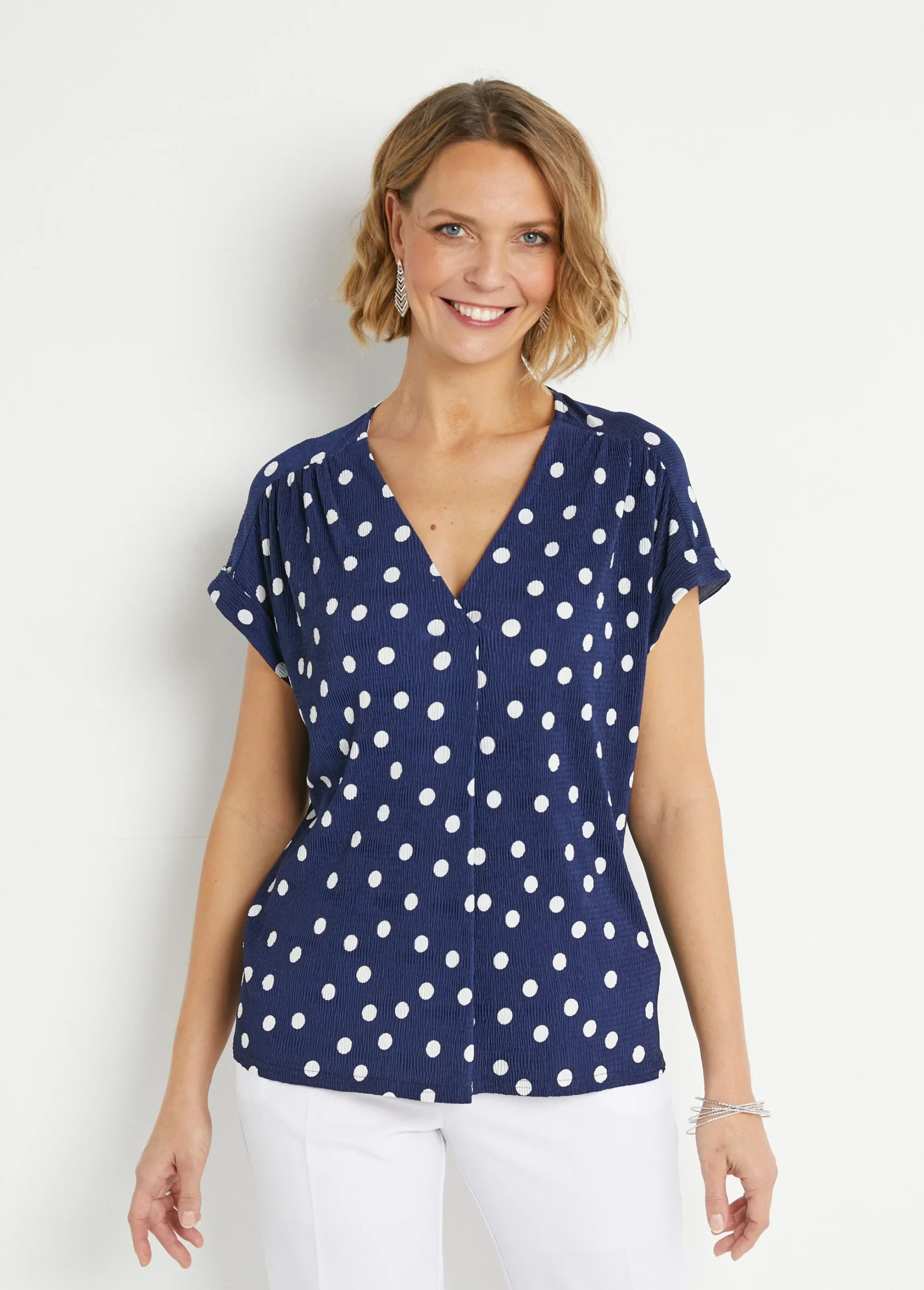 Sur une maille plissée fluide, le T-shirt femme s’interprète en mode féminin raffiné. Sa ligne courte est évasée par un pli creux sous le col V croisé et par un jeu de fronces sous les découpes épaules. Ses manches courtes kimono sont soulignées d’un revers cousu. Base droite. Fabrication française.