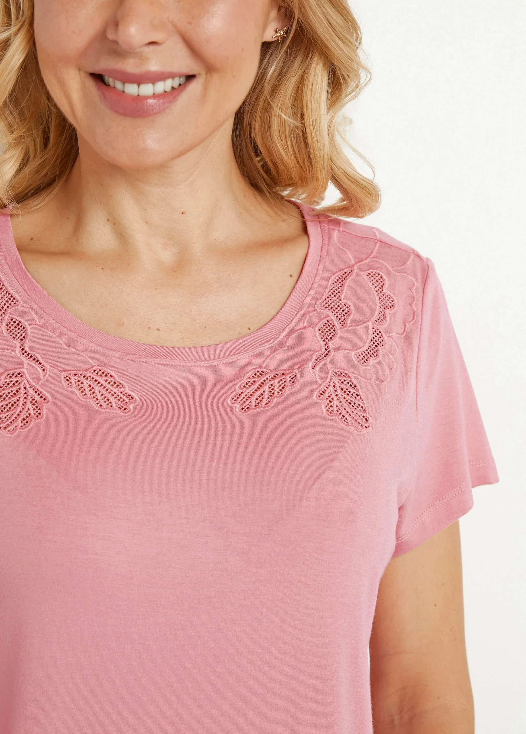 Confectionné dans une maille très qualitative et sublimé d’applications brodées ajourées en ton sur ton sous l’encolure devant et sous les épaules au dos, le T-shirt fait une véritable offensive de charme. Col rond, manches courtes, base droite.