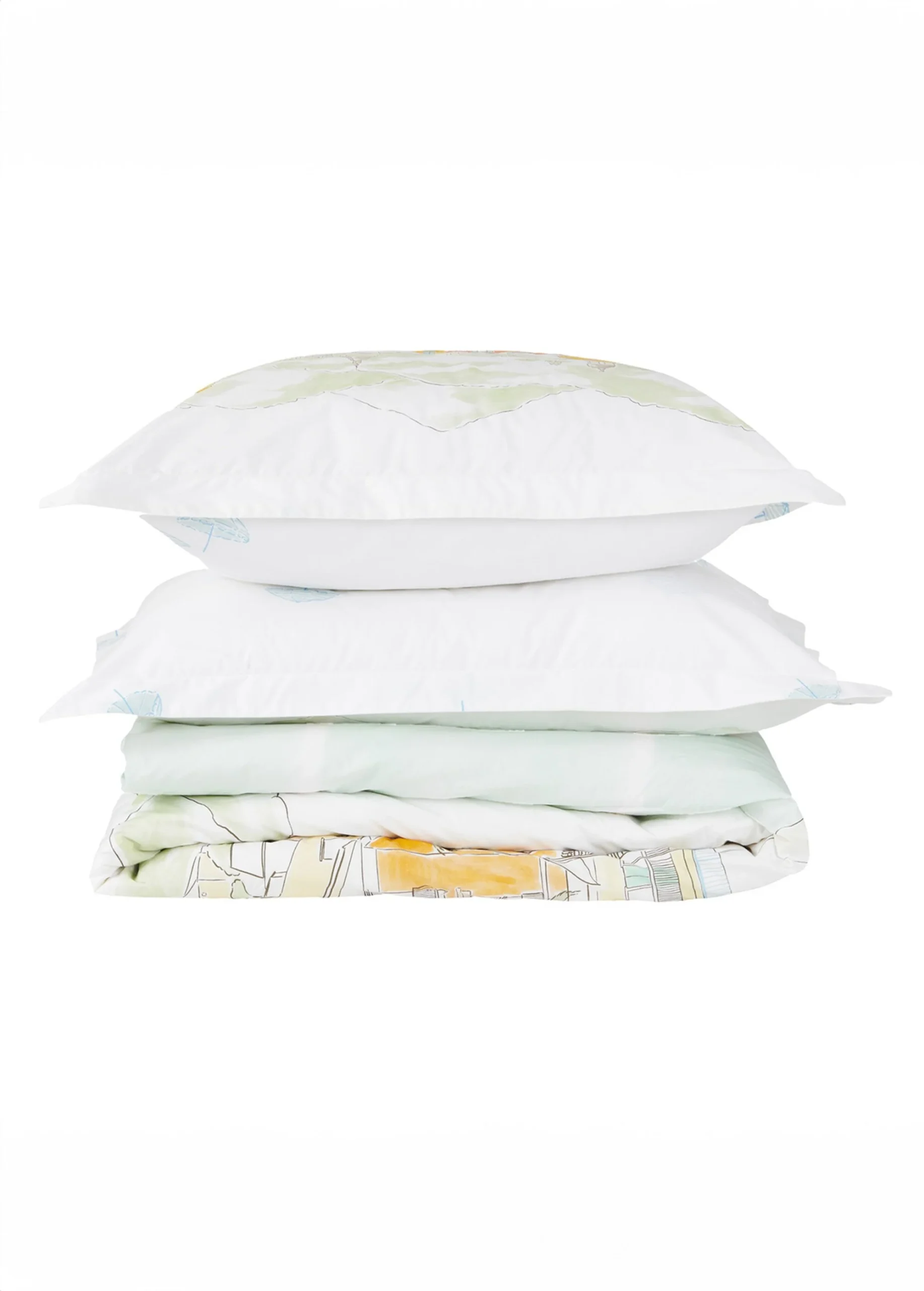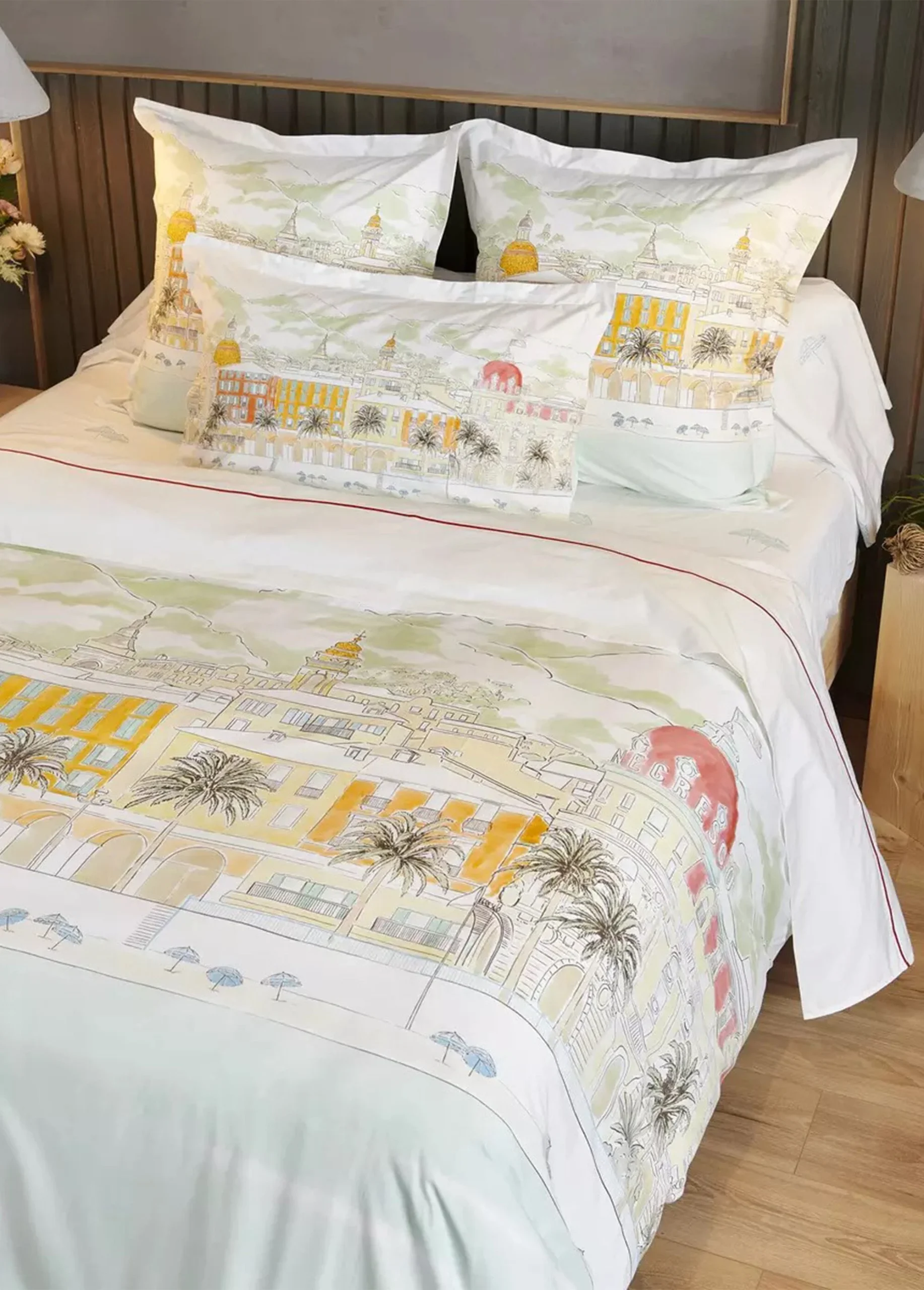 Avec Tradition des Vosges®, transformez votre chambre en un véritable havre de paix avec la parure de lit Nice en percale de coton 120 fils/cm²… une véritable ode à la beauté et au charme de cette ville emblématique ! Chaque pièce de cette parure de lit est ornée de magnifiques détails capturant l’essence de Nice. L’aquarelle colorée de la célèbre Promenade des Anglais ajoute une touche artistique et vivante à votre chambre. Vous admirerez ses détails symboliques tels que le dôme ou la tour Saint-François, apportant une touche d’élégance et de patrimoine à votre lit. La beauté des palmiers et des façades colorées vous donnera une sensation de vacances éternelles. Enfin, rêvez des journées ensoleillées au bord de la mer avec des illustrations détaillées de la plage et des parasols emblématiques de la Côte d’Azur.