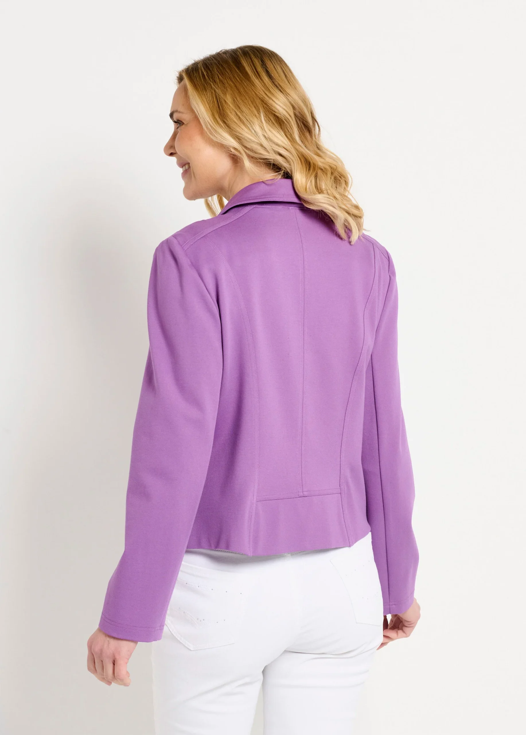 Belle maille milano pour la veste col cranté à la coupe droite légèrement cintrée. Fermeture et 2 poches zippées devant. Découpes princesse devant et dos. Manches longues.