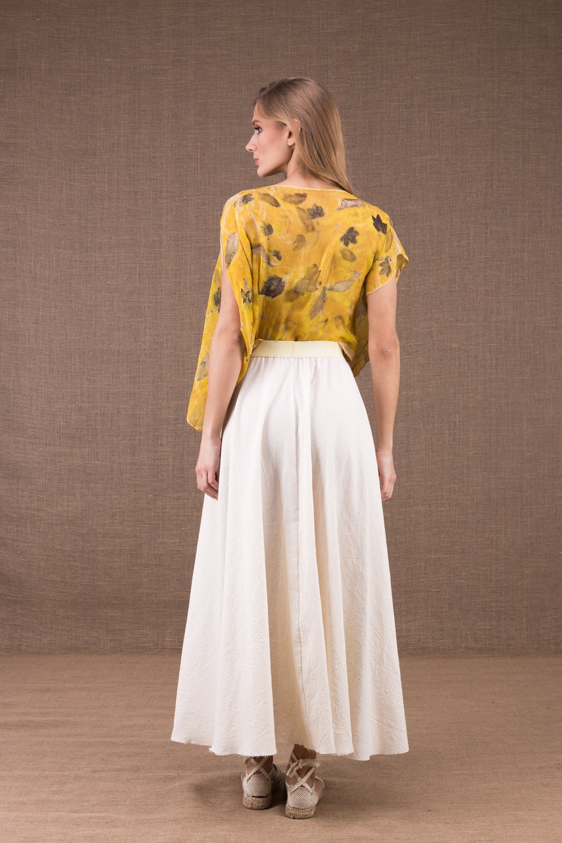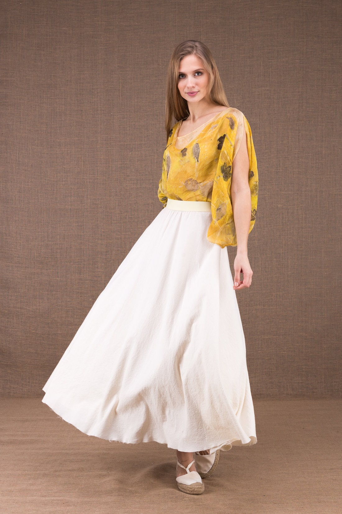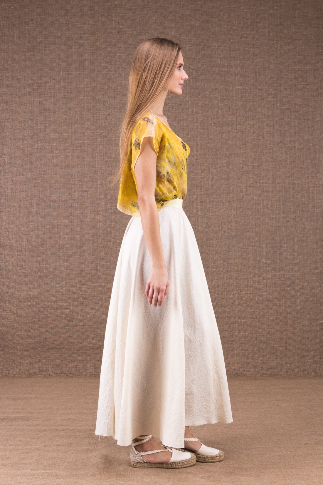 Long flared skirt in organic cotton with a large elastic waist. Discreet or twirling, it will follow all your movements.