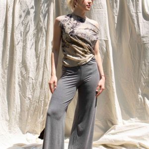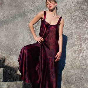 Khaki long backless flared printed organic cotton dress ARALIAS