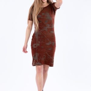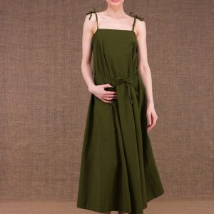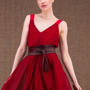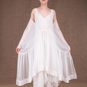 Off white long naked back organic cotton dress with a printed silk apron FEE