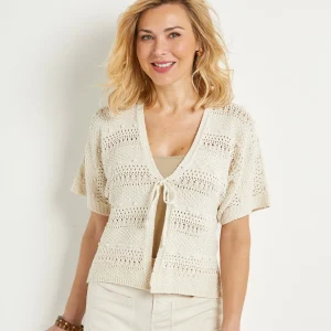 Gilet court ajouré col V à nouer manches courtes
