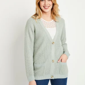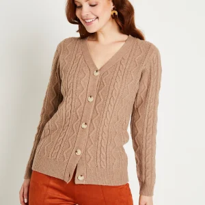 Gilet court boutonné col V maille torsades
