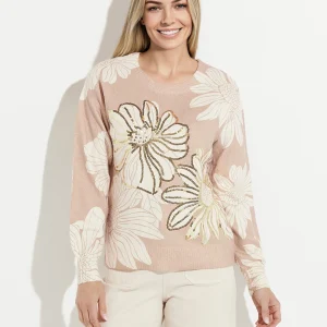 Pull fin imprimé fleurs sequins col rond